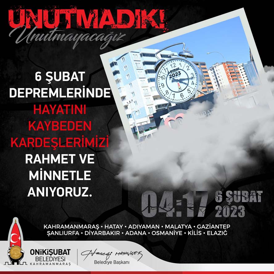 Onikişubat Belediye Başkanı Hanefi Mahçiçek, geçtiğimiz yıl 6 Şubat’ta meydana gelen ve 11 ilde yıkıma neden olan Kahramanmaraş depremlerinin yıl dönümü dolayısıyla anma mesajı yayımladı.