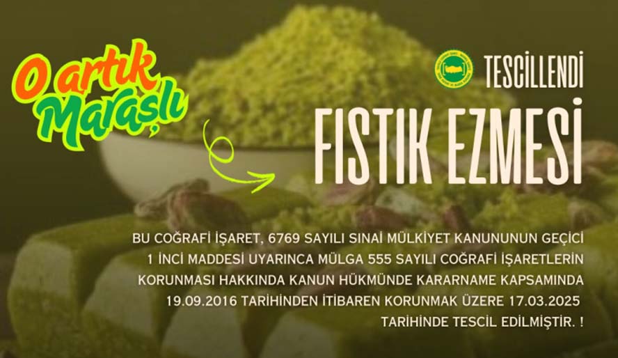Büyükşehir Belediyesi tarafından yapılan başvuruyla “Maraş Fıstık Ezmesi”, Türk Patent ve Marka Kurumu tarafından tescillenerek resmiyet kazandı. Böylece Maraş Fıstık Ezmesi, şehrin tescilli yöresel ürünleri arasında yerini aldı.
