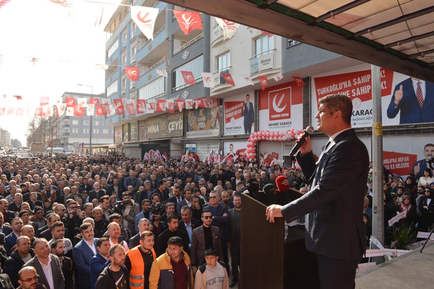 Yeniden Refah Partisi Türkoğlu Seçim Koordinasyon Merkezi açılışı adeta mitinge dönüştü. Binlerce Türkoğlu’lu Yeniden Refah Partisi’nin programına adeta akın ederken, Türkoğlu Belediye Başkan Adayı Mehmet Karaca, hemşerilerinden yoğun ilgi gördü.