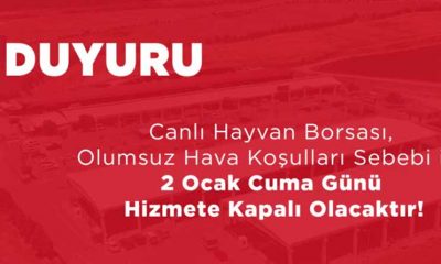 Büyükşehir Belediyesi, olumsuz hava koşulları nedeniyle Canlı Hayvan Borsası’nın 2 Ocak Cuma günü hizmete kapalı olacağını duyurdu.