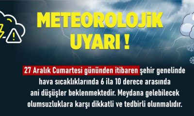 Büyükşehir Belediyesi Afet Koordinasyon Merkezi, 27 Aralık Cumartesi gününden itibaren şehir genelinde hava sıcaklıklarında 6 ila 10 derece arasında ani düşüşler yaşanacağını belirterek dikkati ve tedbirli...
