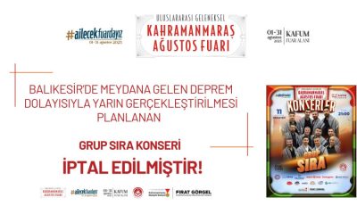 Büyükşehir Belediyesi, Geleneksel Ağustos Fuarı’nda 11 Ağustos Pazartesi günü (bugün) gerçekleştirilmesi planlanan Grup Sıra konserinin, Balıkesir’de meydana gelen deprem dolayısıyla...